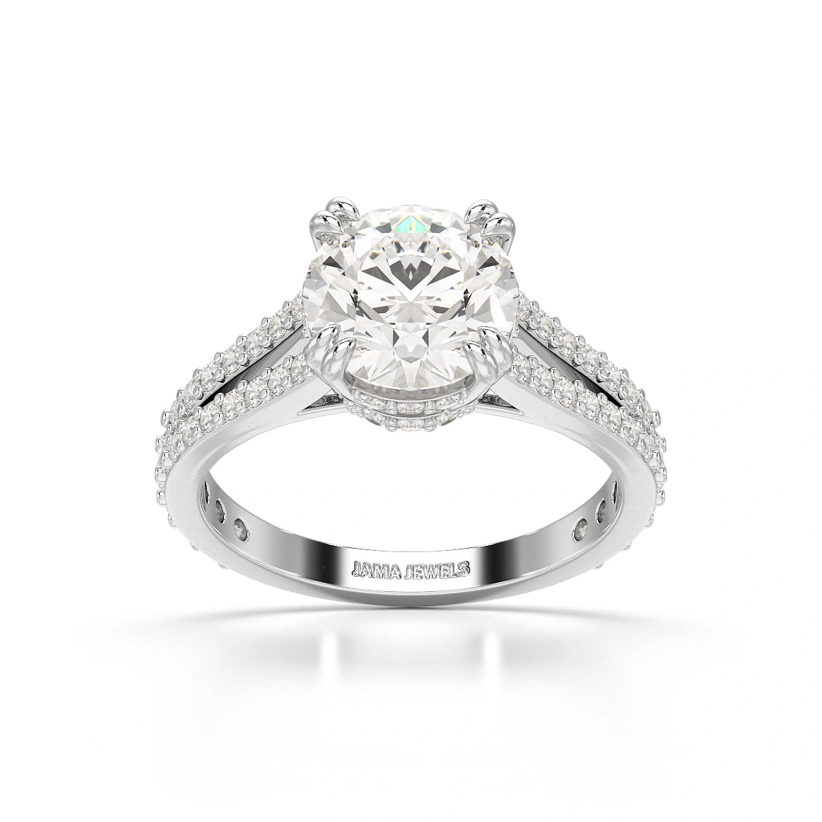 Elevate your elegance with the Jama Jewels 2.65 CT Round Cut Hidden Halo Lab Diamond Ring. This stunning piece features a 2.65-carat round-cut lab-grown diamond, expertly set with a discreet hidden halo that enhances the stone's brilliance while maintaining a sleek and sophisticated design. The hidden halo adds an extra layer of sparkle, subtly illuminating the center diamond from all angles. Crafted for those who appreciate understated luxury and sustainable craftsmanship, this ring is a perfect symbol of timeless beauty and modern refinement, ideal for engagements or any special moment that calls for a touch of brilliance.