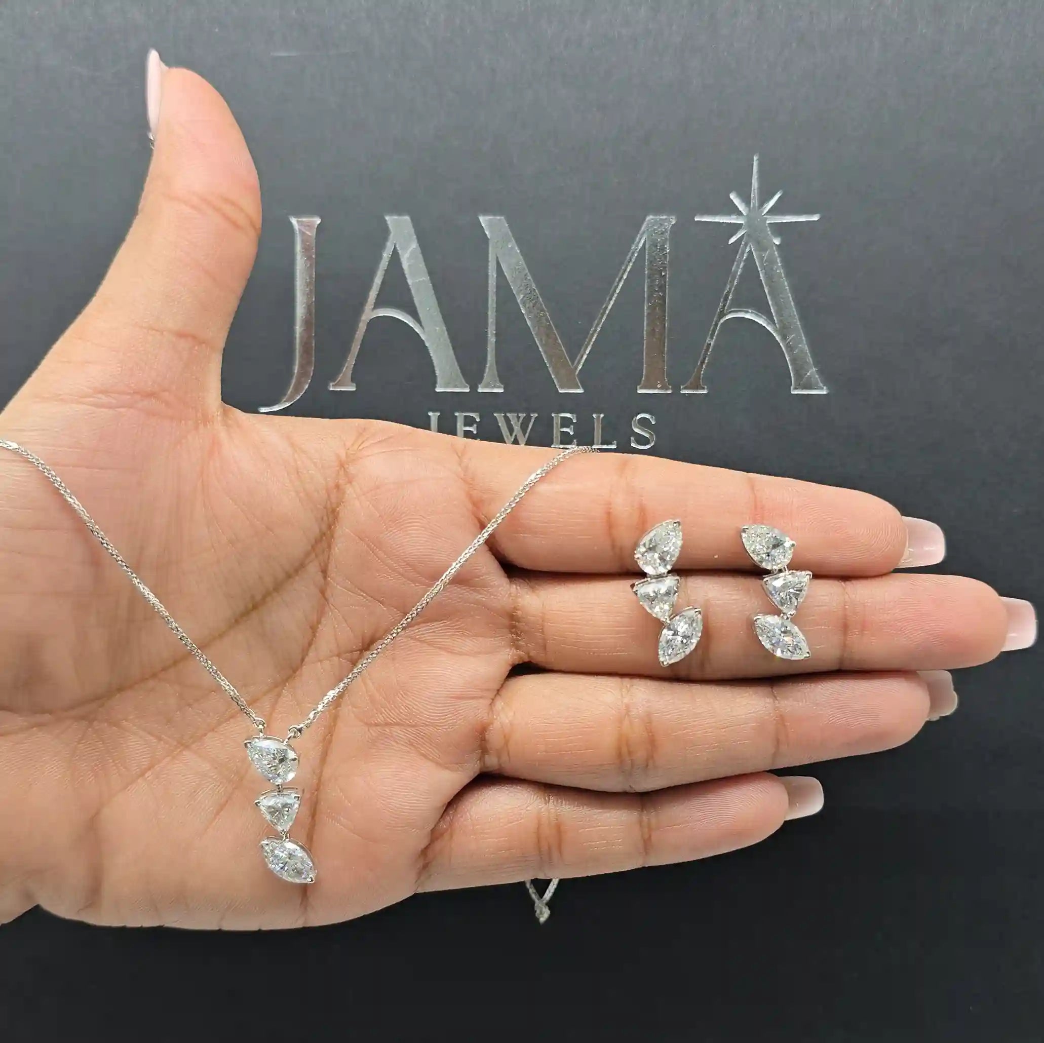 Make a graceful statement with the 7.70 CT Three Stone Drop Diamond Jewellery Set, featuring a beautifully matched earring and chain pendant duo. Designed with three shimmering lab-grown diamonds in a classic drop arrangement, this set captures timeless elegance with a modern, ethical touch. Each stone is meticulously set to maximize brilliance and movement, creating a refined sparkle that enhances both special occasion attire and elevated everyday looks. Crafted with precision and care, this jewellery set blends sophistication, balance, and sustainable luxury.
